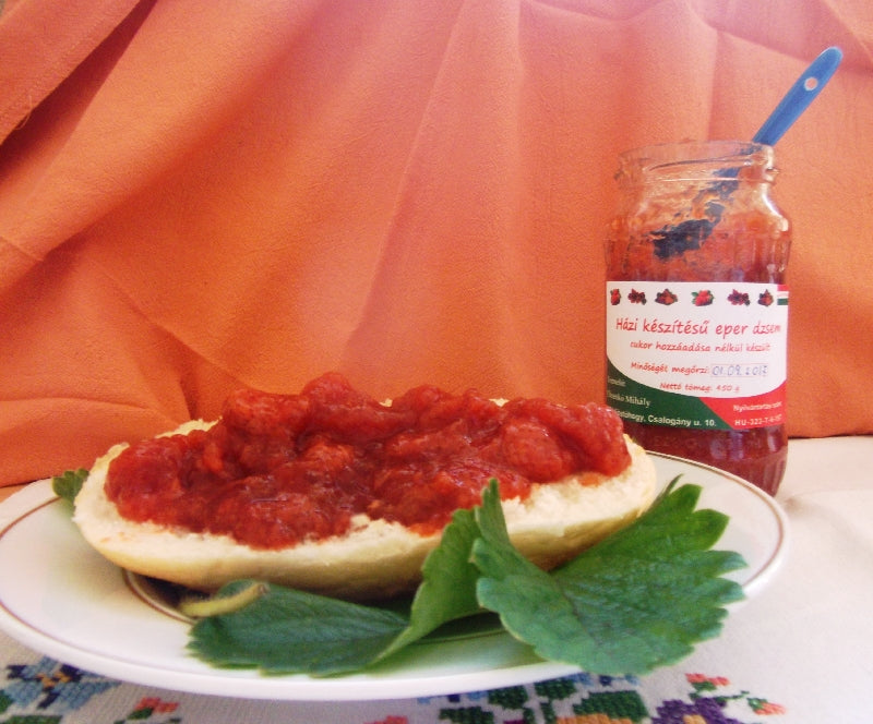 Kiskertben termett eperből, kevés cukorral, házi eljárással készült lekvár, a nyár ízeit tartósítja.