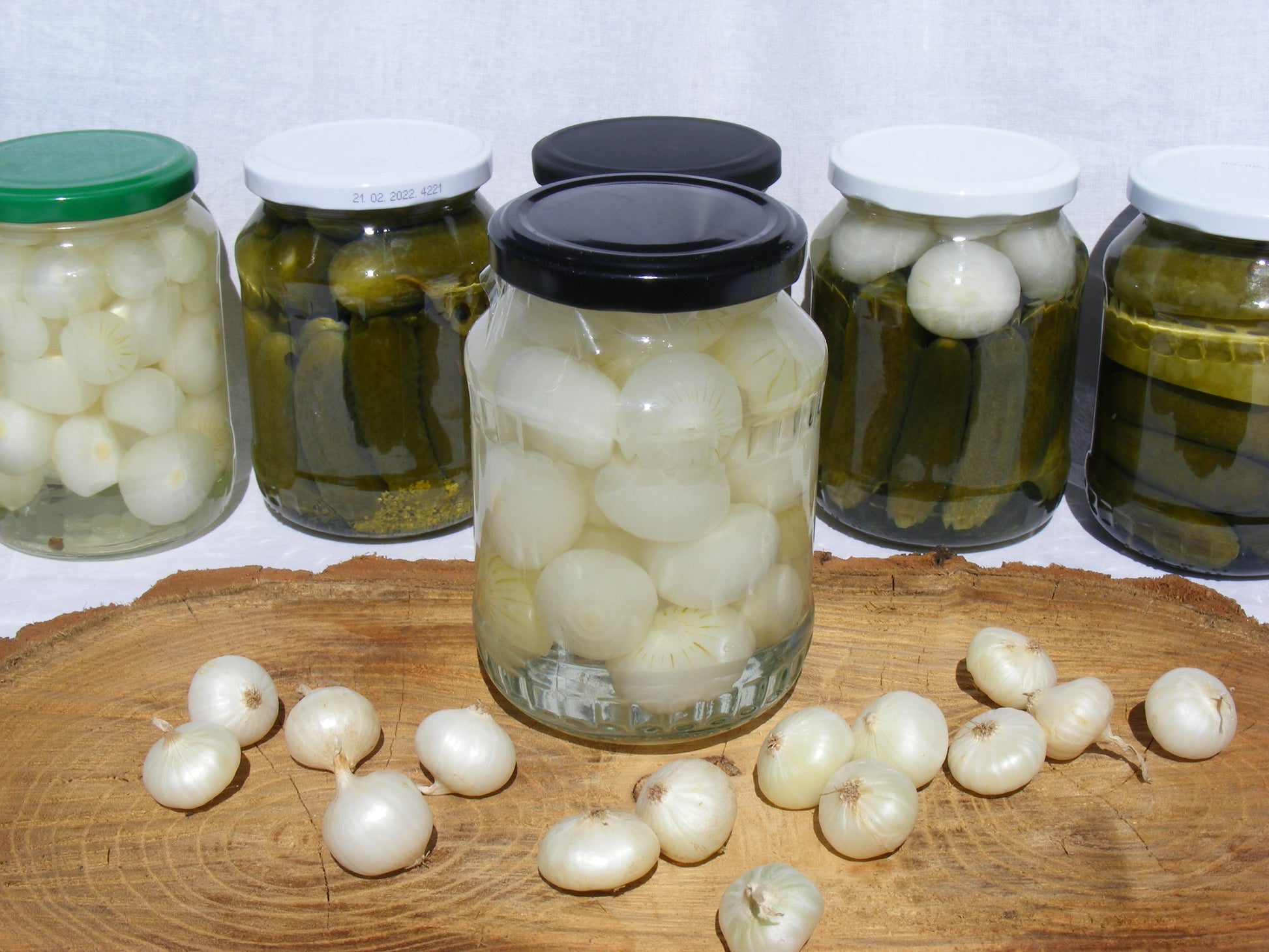 Saját kertünkben termelt gyöngyhagymából készült édes-ecetes savanyúság.