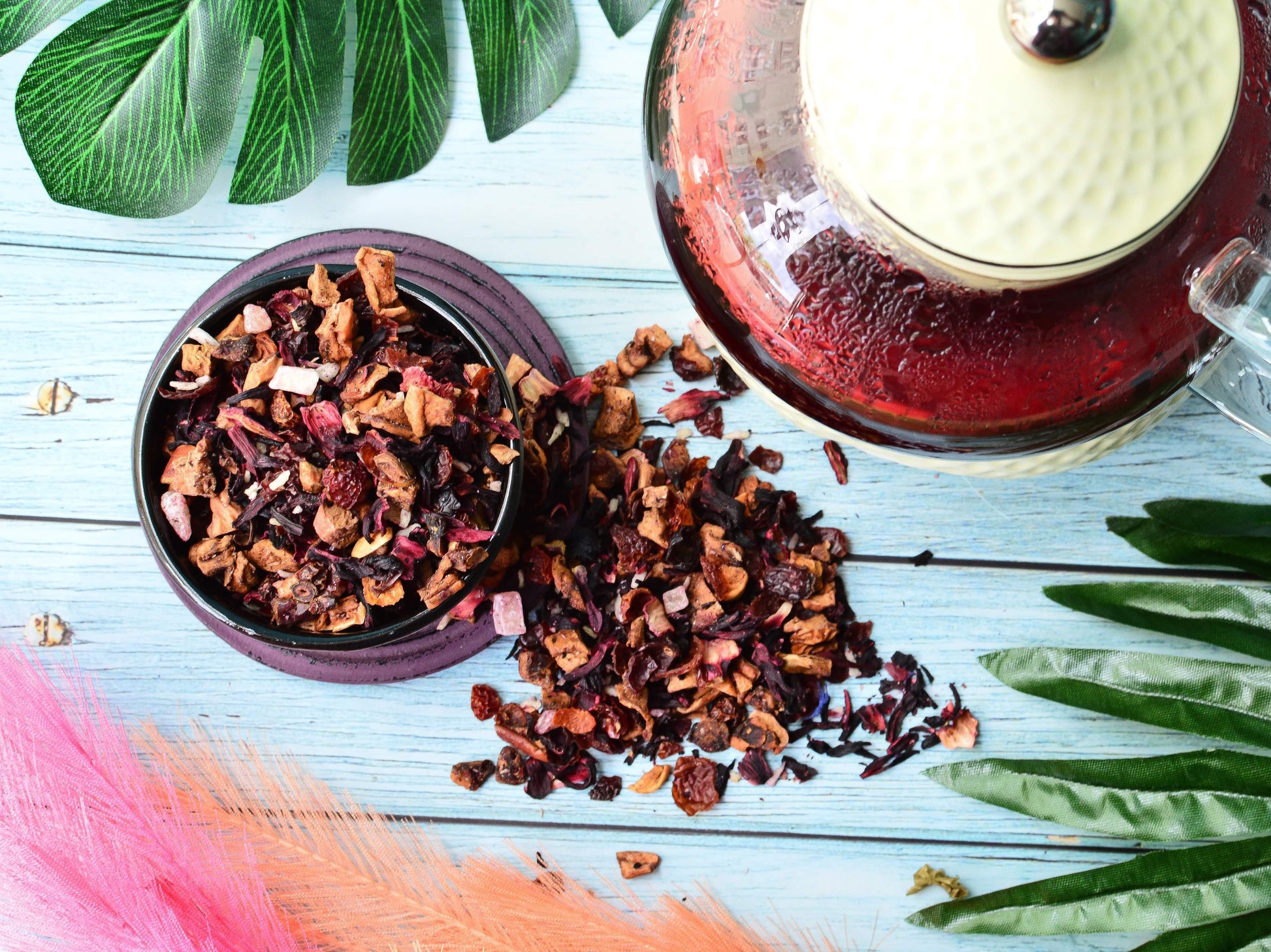 Összetétele: ananászdarabok, málnadarabok, hibiszkusvirág, csipkebogyóhéj, narancshéj, kókuszdarabok, meggy