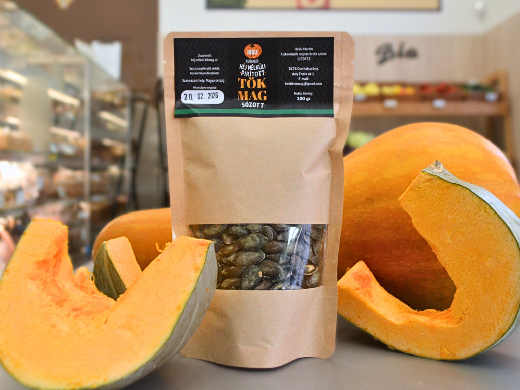 Tisztított és válogatott héj nélküli olajtökmag pirítva sós izesítésekben, 100 g kiszerelésben. Egészséges nassolnivaló mindenkinek.
