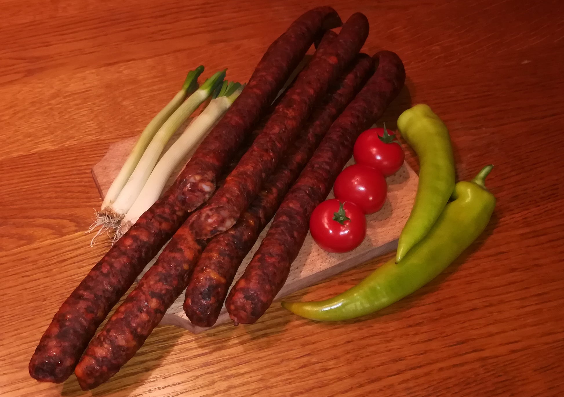 Saját nevelésű mangalica húsából, saját recept alapján készített csípős félszáraz kolbász.
