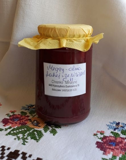 Újfehértói fürtös meggyből és nyári almából készült fahéj ízesítéssel. Cukor hozzáadása nélkül.
