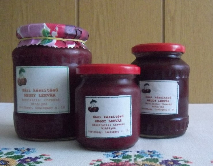 Saját kertünkben termett, Újfehétói fürtös meggyből készült, 100% gyümölcsöt és kevés cukrot tartalmaz. A készítés során dzsemfixet használtam.