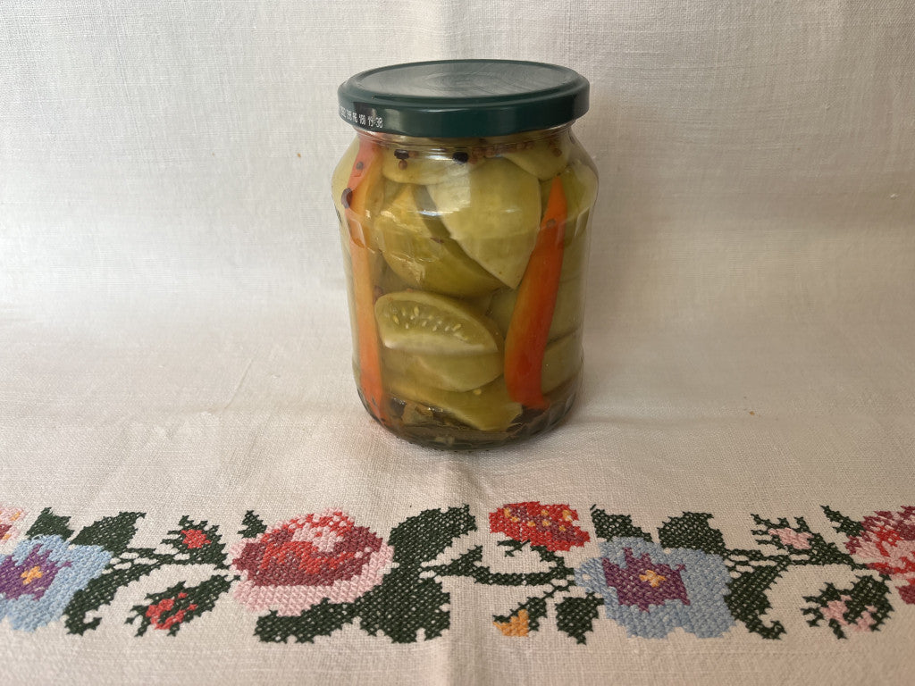 Összetevők.: zöld paradicsom,ecet,cukor,só,fűszerek,víz.